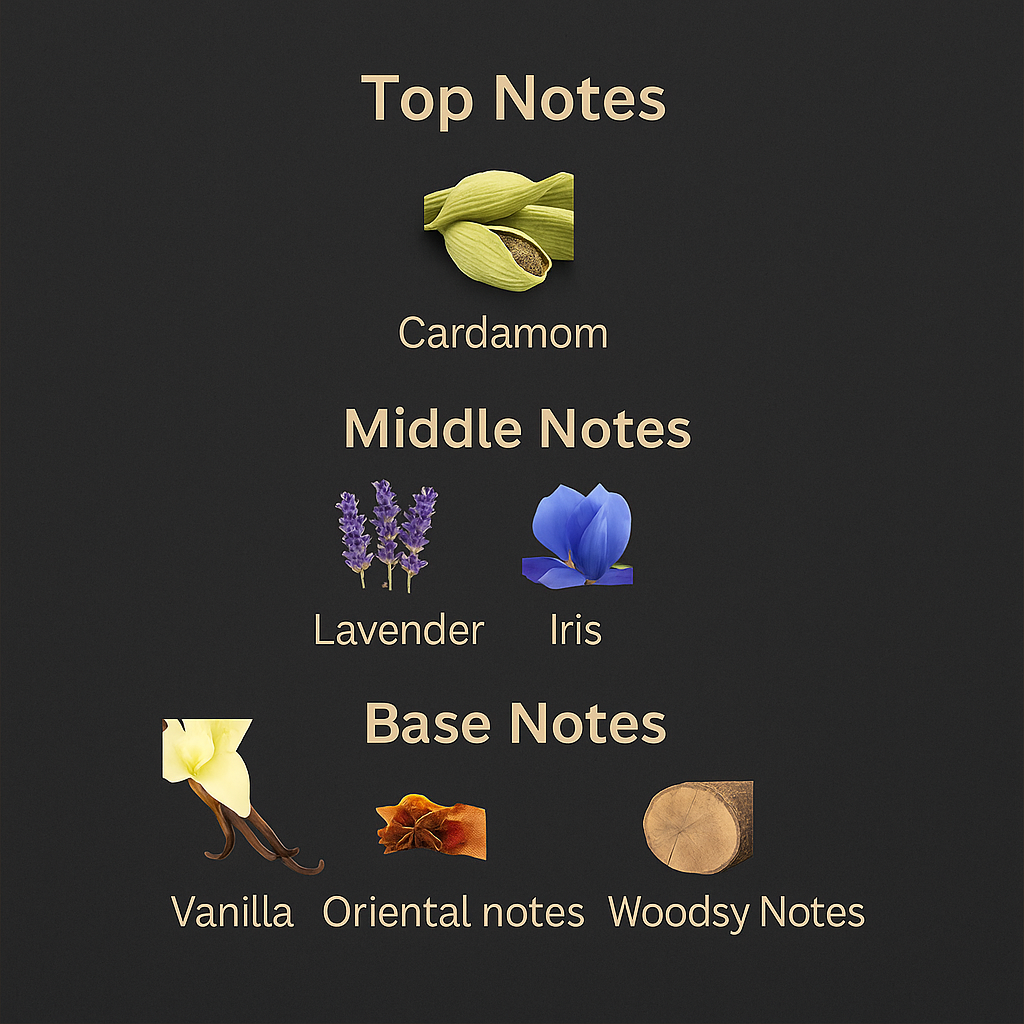 At its heart, smooth vanilla and powdery iris blend into a refined yet powerful accord, balancing modern sophistication with bold masculinity.