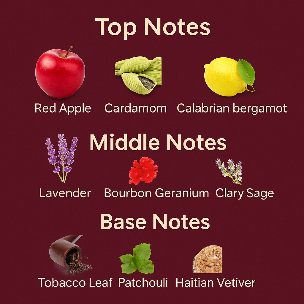 At the heart, clary sage and lavender add smooth refinement, like confidence dressed in a tailored jacket.
