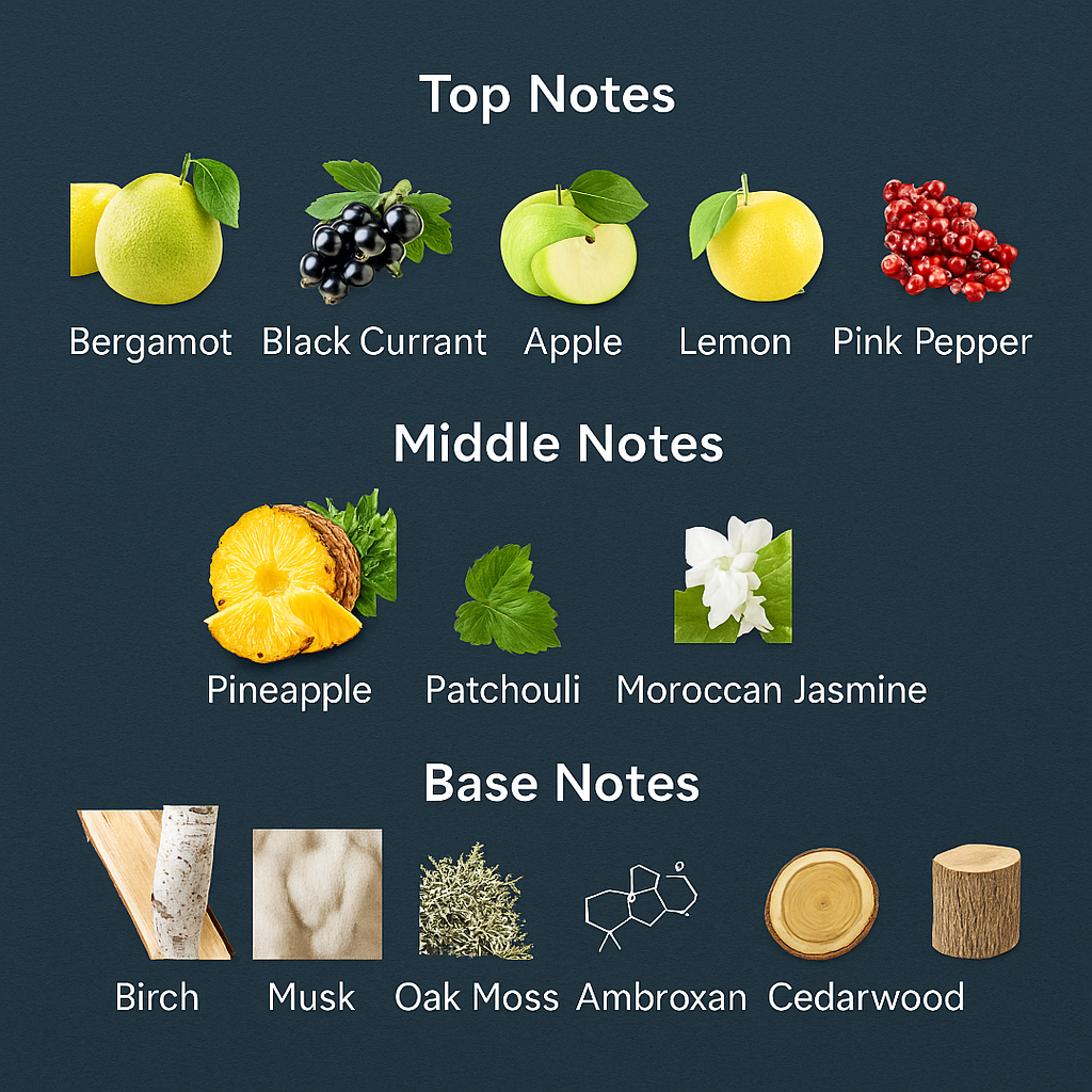 The heart blends birch, patchouli, and jasmine, giving it a smoky elegance that balances presence with polish.