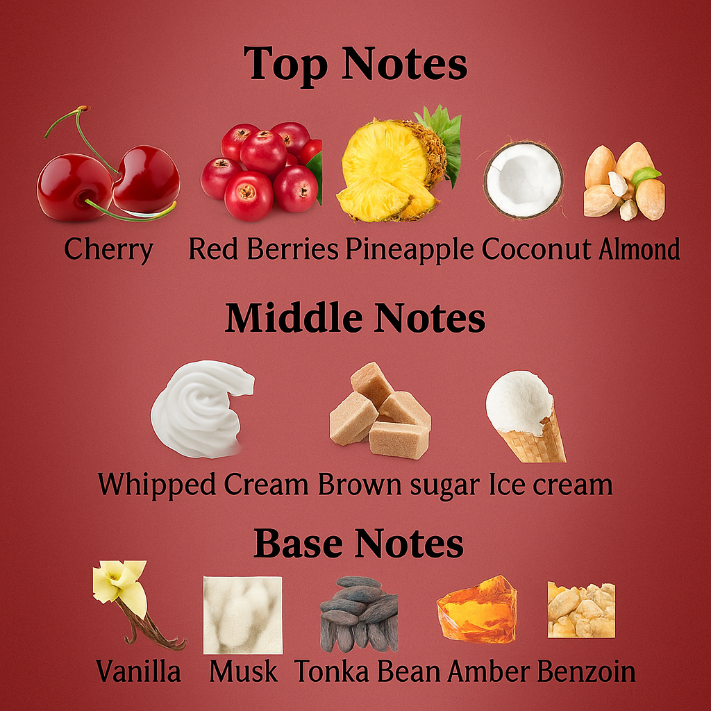 The scent opens in juicy cherry and red berries, sparkling like sunlight through a ruby glass. As it melts into whipped cream, brown sugar, and coconut, it turns creamy, decadent, and softly magnetic. Finally, the base settles into vanilla, amber, tonka, and musk, leaving a glowing, sweet-amber aura that clings like silk on skin.