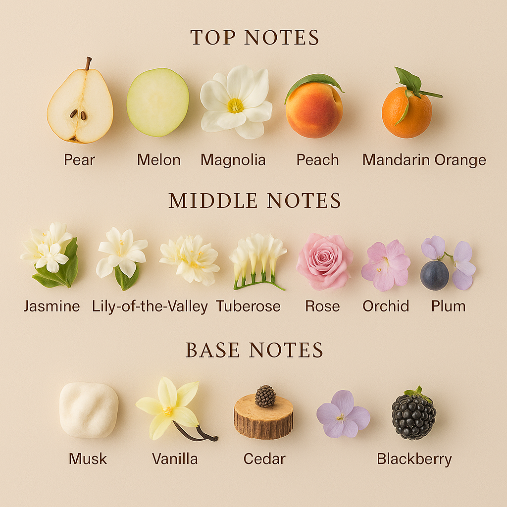 Top Notes: Ylang-Ylang, Neroli, Pear